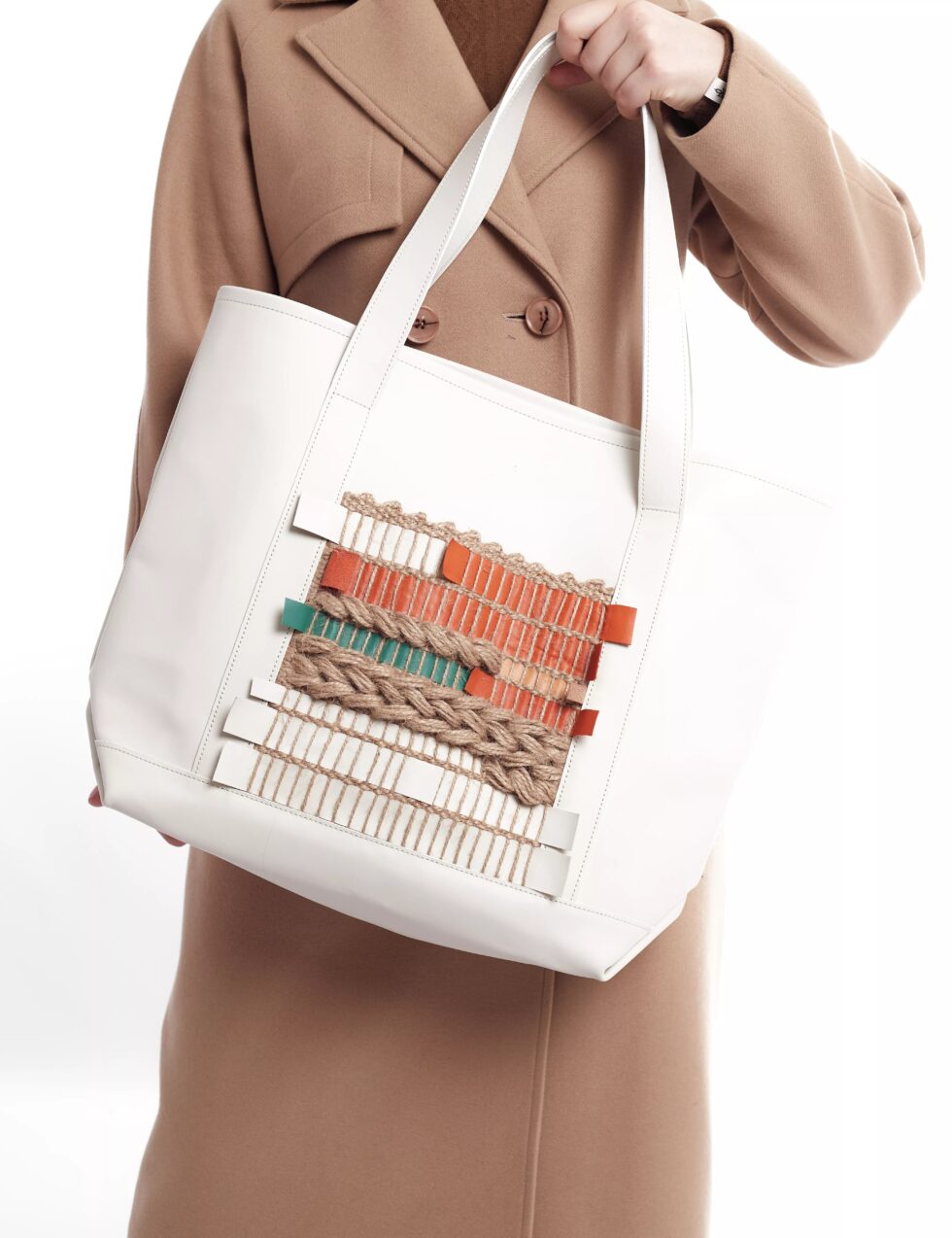Неймовірно місткий, акцентний і унікальний. Зовнішня кишеня виконана вручну в техніці ручного ткацтва. Крім зовнішньої накладної кишені, всередині є додаткові кишені на блискавці та відкриті. Шопер має відкритий доступ.